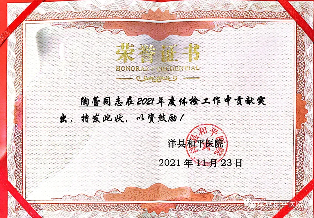 恭贺陶主任荣获洋县和平医院“优秀组织奖”!