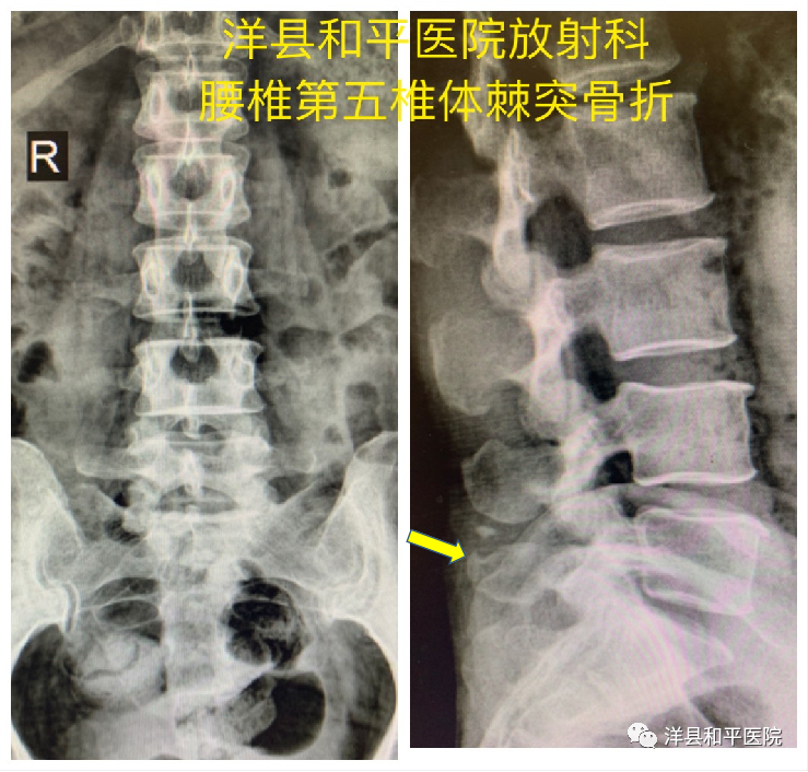 患者苗某某,中年女性,因家务劳动后,突然出现腰部疼痛,当时未在意,并未及时就医,逐渐疼痛加重,无法行走,腰部直立困难,生活无法自理,故来和平医院诊治,经DR拍片检查提示:腰椎第5椎体棘突骨折。