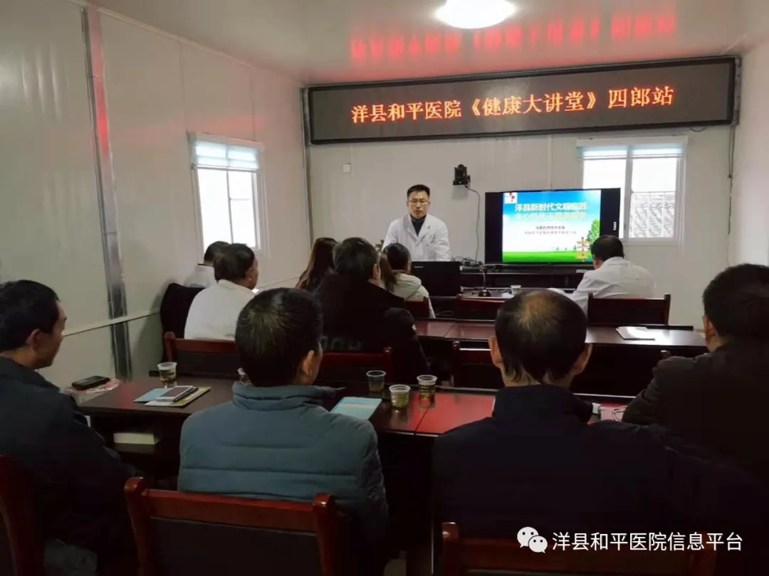 2020年12月4日下午,洋县和平医院在洋县卫健局的领导下,洋县科学技术协会的支持下,洋县和平医院《健康大讲堂》四郎站正式开讲!由洋县和平医院院长张颖龙、工会主席刘宝文、医务科长侯红星等组成的专家团队进行业务讲座。主要内容包括疫情防控重点、高血压知识讲座、常见毛发疾病诊治进展等。参加会议的有:四郎镇卫生院全体医护人员及各村村医,会议由何院长主持,现场学术气氛活跃,此次《健康大讲堂》活动提高了基层医生的临床诊治水平,拓展了乡村医生的临床思维,为乡镇卫生事业的发展奠定了良好的基础。
