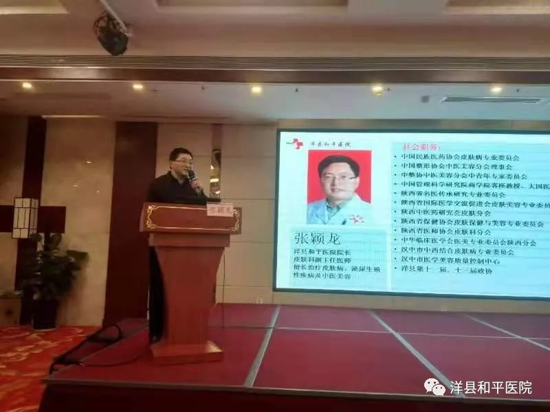 洋县和平医院院长、中国民族医药协会皮肤专业委员会副会长、皮肤科副主任医师张颖龙在全国中西医结合诊治皮肤病学习班暨陕西省中医中西医结合皮肤病专业委员会学术研讨会上演讲了《我与学科共成长》,阐述了皮肤科该如何发展、人才培养、学科核心竞争力等方面的前沿话题,赢得了在场专家们的一致好评。