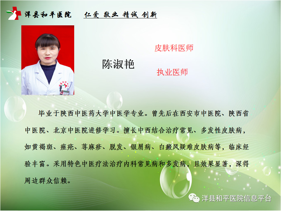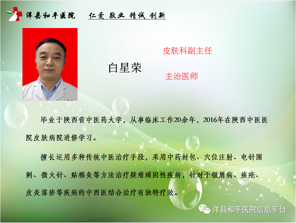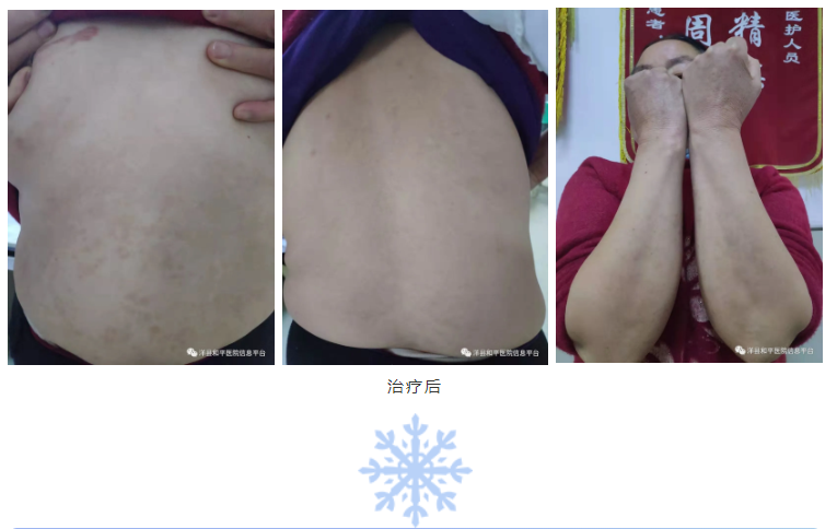 入院后给予皮肤科特色治疗,过程中以中医药为主,未使用任何激素类药物,患者非常放心,每天都有明显减轻,见了医护人员乐呵呵的竖起了大拇指。并且非常感谢公交车司机的热心推荐洋县和平医院就诊!