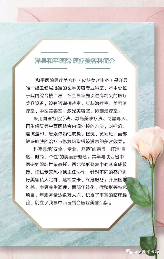 洋县和平医院是集医疗、预防、保健为一体的综合性医院,是汉中市城乡居民、城镇职工医保定点医院。医院交通便利,环境优雅,建筑面积8500平方米,开放床位80张,技术力量雄厚,现有职工80余人,其中中高级职称20人。以皮肤科、医疗美容科、口腔科为特色,并设有内、外、妇、儿、五官、中医、疼痛、医学影像、检验、碎石科等多个临床医技科室。最新引进BN-PFMF-8001高端皮肤镜、CO2点阵激光、调Q激光、光子嫩肤仪,用于检测治疗多种皮肤顽疾。拥有DR、口腔CT、四维彩超、过敏源检测治疗系统、NB-UVB紫外线光疗机、红蓝光治疗仪、体外碎石机、幽门螺杆菌检测仪、中药木桶浴等设备。我院以“仁爱、敬业、精诚、创新”为院训,以“专业品质、业务精湛、仁德俱全”为经营理念,强化内部管理、不断更新设施、优化服务流程、减轻患者负担,努力为患者提供精湛的医术和良好的就医体验,为全县人民的健康保驾护航。