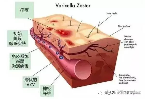 是由长期潜伏在脊髓后根神经节或颅神经节内的水痘-带状疱疹病毒经再激活引起的感染性皮肤病。由于病毒具有亲神经性,感染后可长期潜伏于脊髓神经后根神经节的神经元内。当抵抗力低下或劳累、感染、感冒时,病毒可再次生长繁殖,并沿神经纤维移至皮肤,使受侵犯的神经和皮肤产生强烈的炎症。