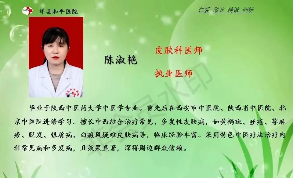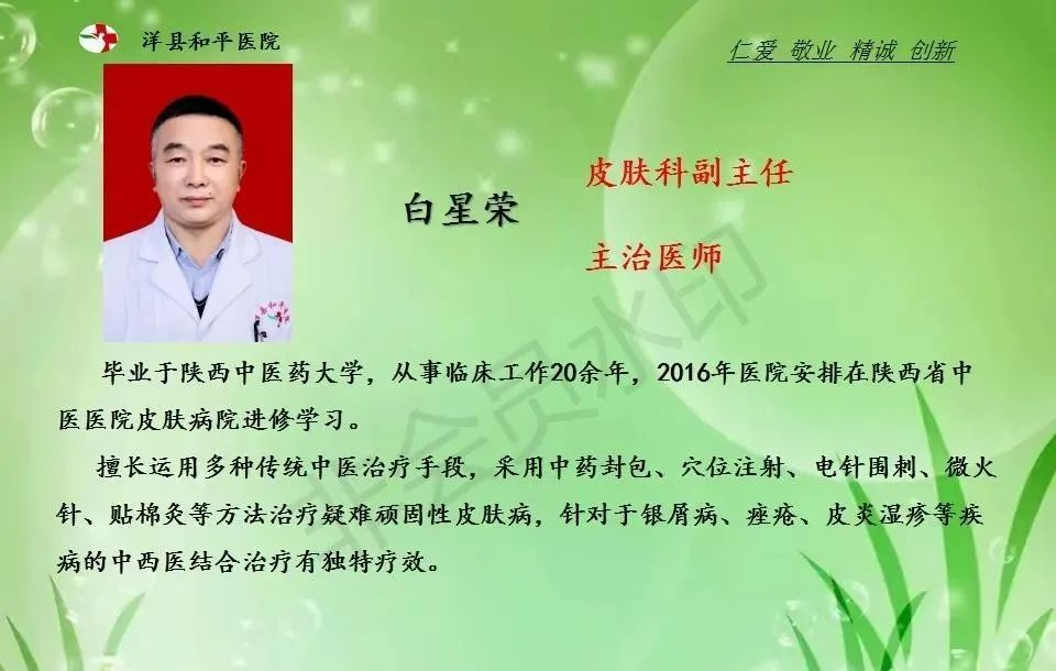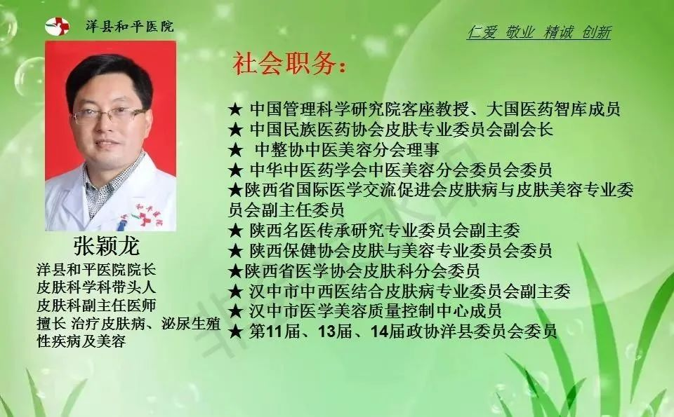 洋县和平医院皮肤科 系医院重点专科,张颖龙院长亲自坐诊,医院多次安排医护人员在西京医院、西安交大二院、省中医研究院、唐都医院进修培训学习,参加学术会议,形成了皮肤科专业团队。近年来特邀省、市皮肤科专家定期坐诊、查房、授课。