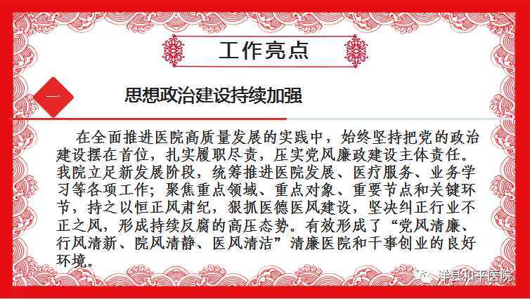 会议上,院长张颖龙汇报全年工作。张院长简要总结了2023年度医院思想政治建设、学科建设、品质管理、温度医院、文化建设、后勤保障、宣传管理、健康体检等方面的亮点,对各科室的工作给予了充分肯定,同时对存在的不足进行深度剖析,并对下一年度的工作进行了安排部署,加强落实“精政策、善沟通;正能量、提素质;强管理、细算账;新服务、速保障”四个要求,以患者为中心,积极开展优质服务,进一步优化服务流程,提升人员素养,落实“临床+服务+健教”工作模式,多措并举改善就诊感受,提升患者就医感受,打造有温度的医院。